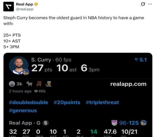 凭借这样的表现,37岁302天的库里成为NBA历史上单场砍下至少25分10助且命中至少5记三分最年长的后卫。