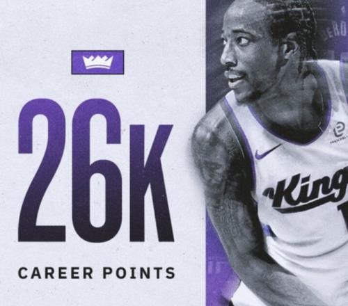 在国王对阵火箭的比赛中,德罗赞迎来生涯里程碑时刻。比赛开始不久他便拿到6分,这让他的生涯常规赛总得分突破26000大关,成为现役第六人!